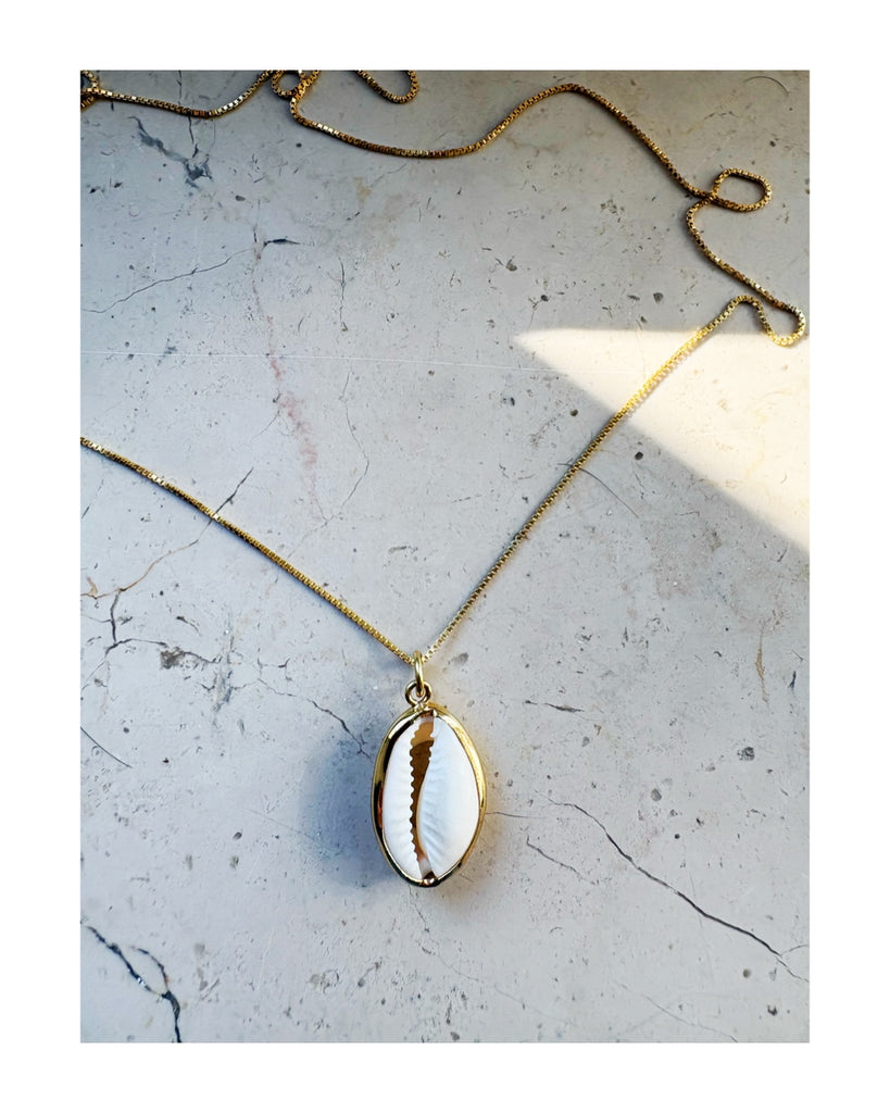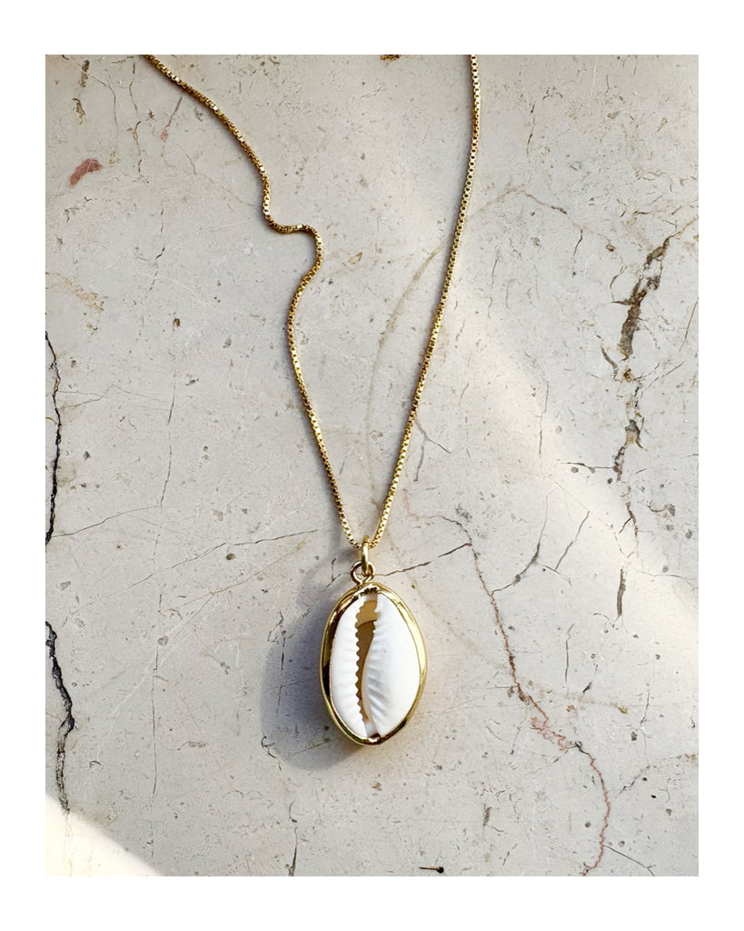Collana in argento placcato oro avente come ciondolo una ciprea bordata in oro. Lunghezza 56 cm.