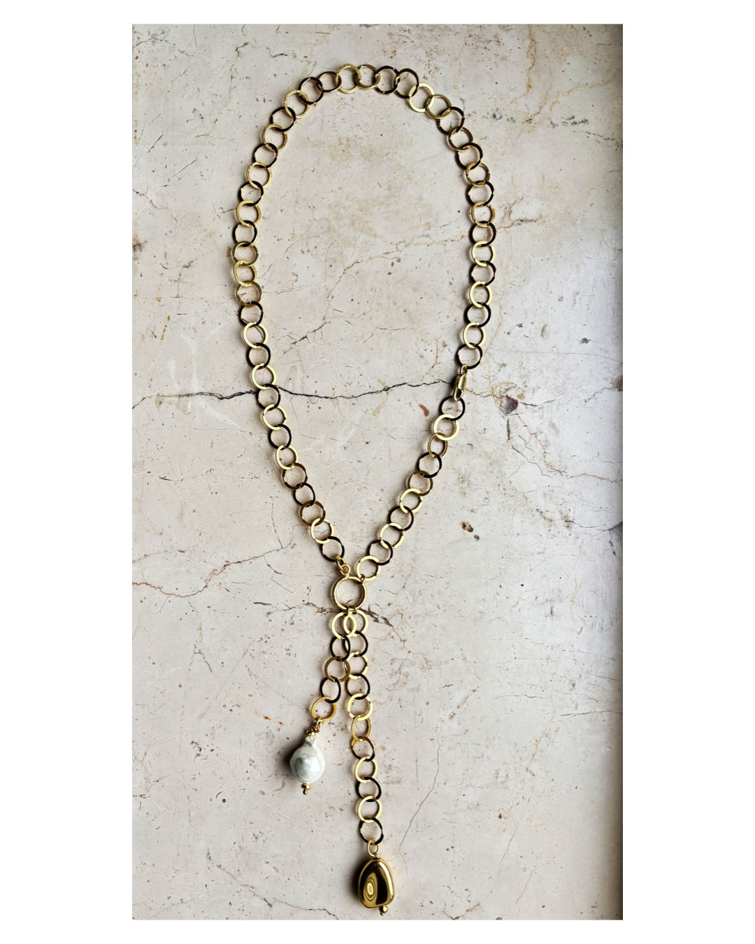 Collana in argento placcato oro 18 kt con maglia a motivo geometrico circolare, impreziosita da due ciondoli: una perla di fiume e un piccolo ciondolo a forma di fagiolo.