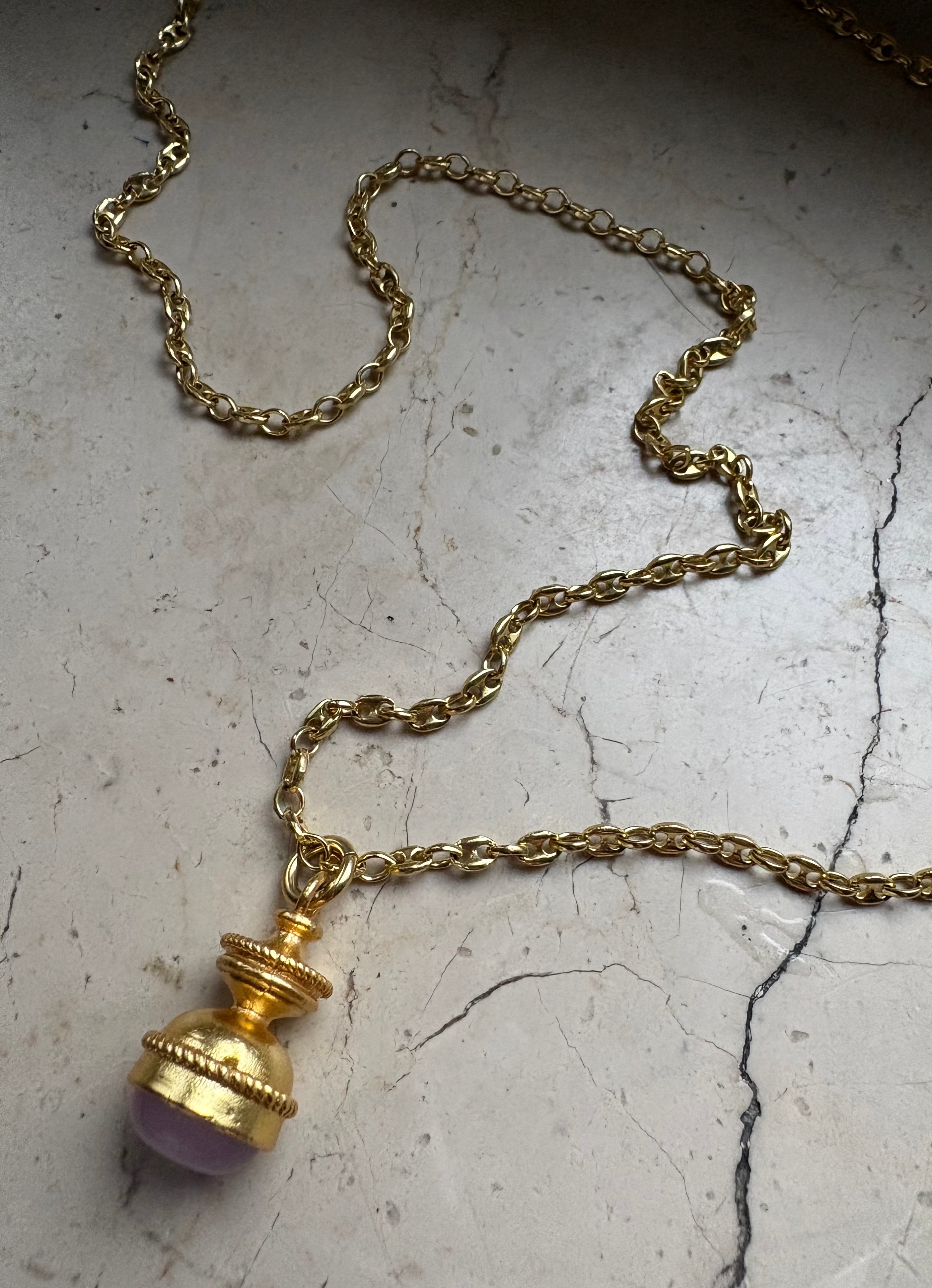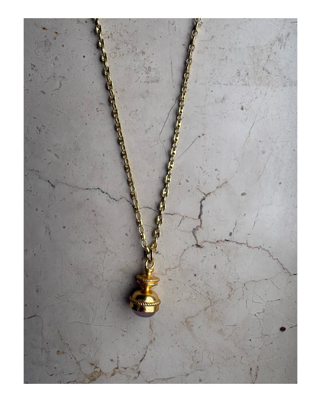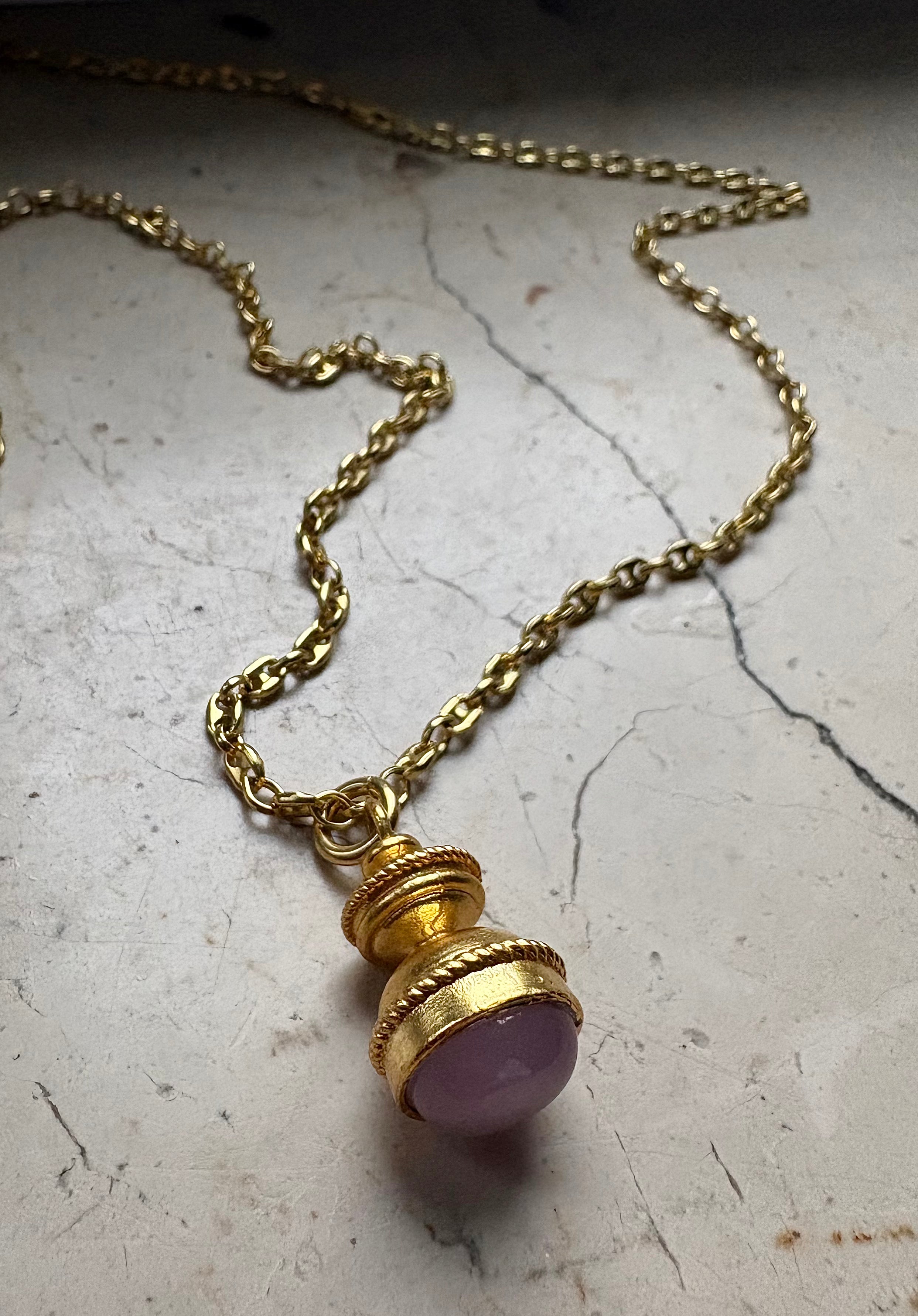 Collana maglia marinara in argento placcato oro, con ciondolo finale impreziosito da pietra in quarzo rosa. Lunghezza 72 cm.