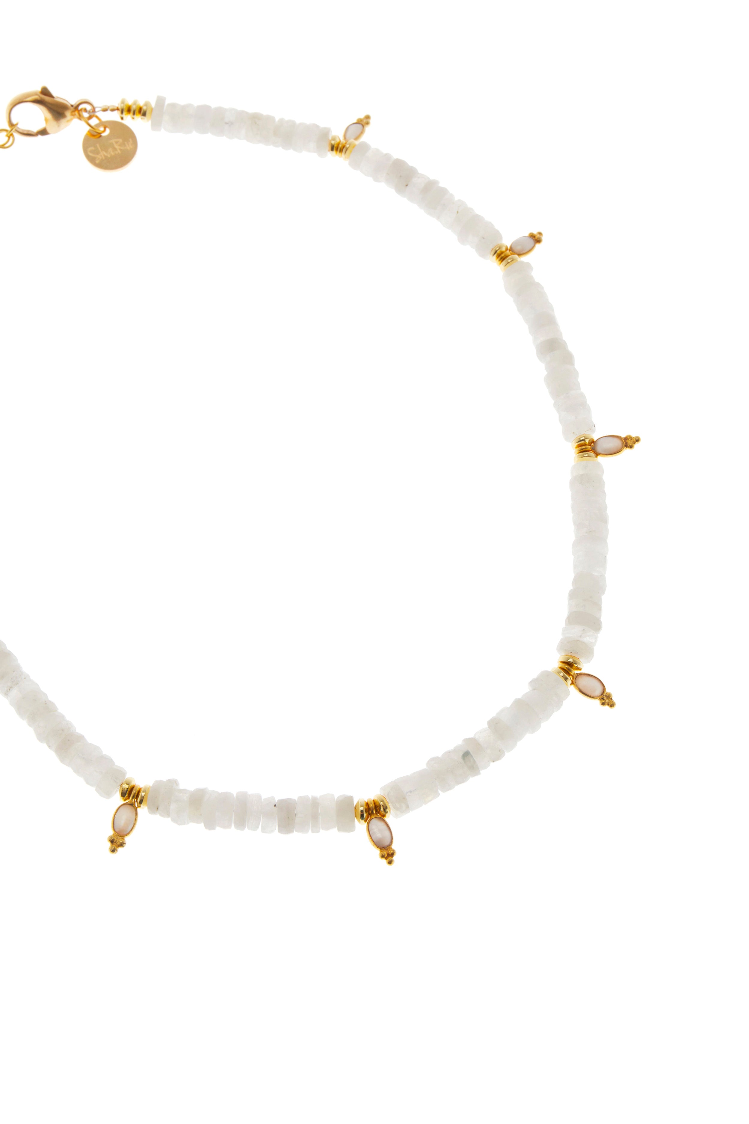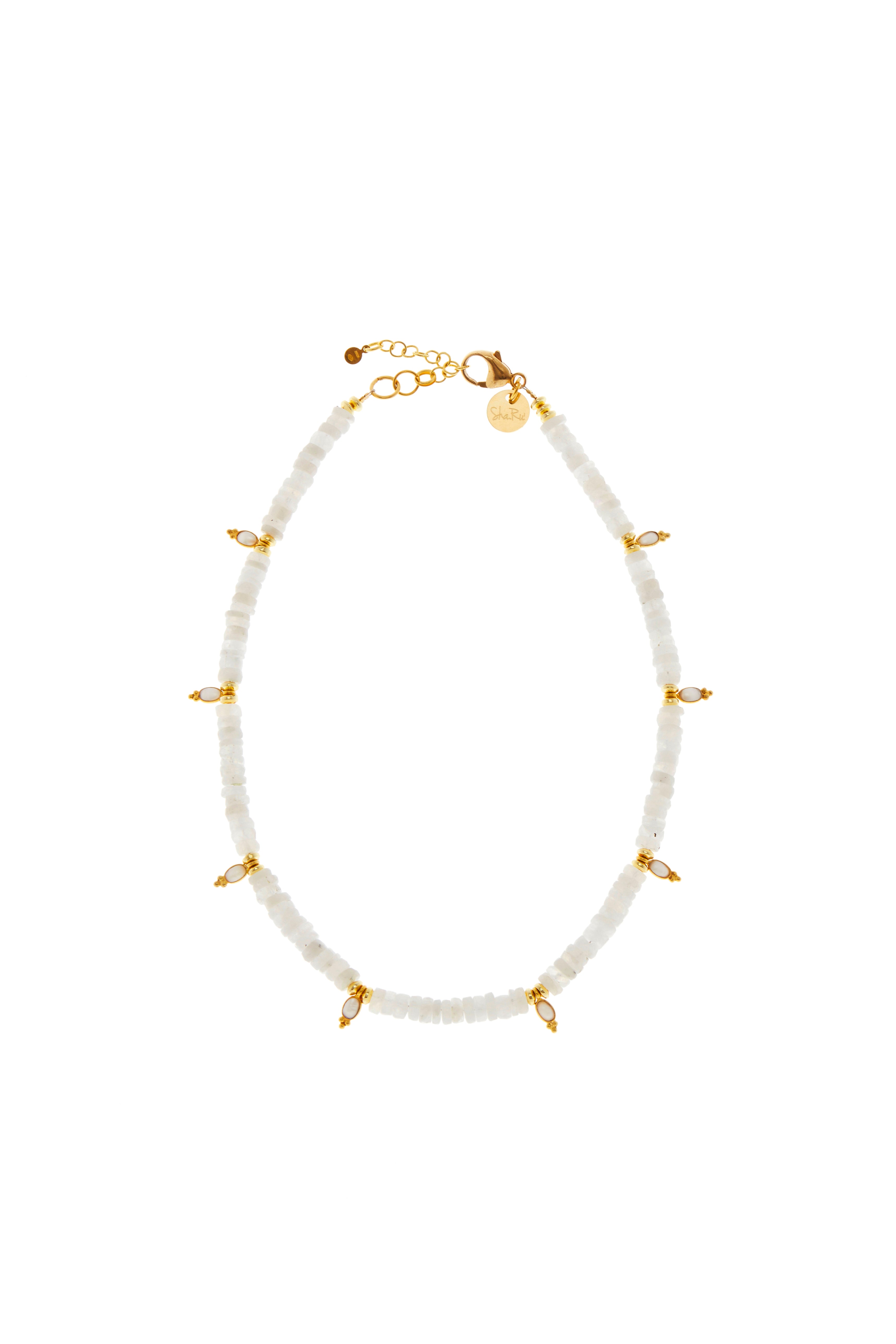 Collana in ruote irregolari di labradorite bianca intervallata da pendenti in quarzo bianco e argento placcato oro 18 kt. Lunghezza 41 cm.