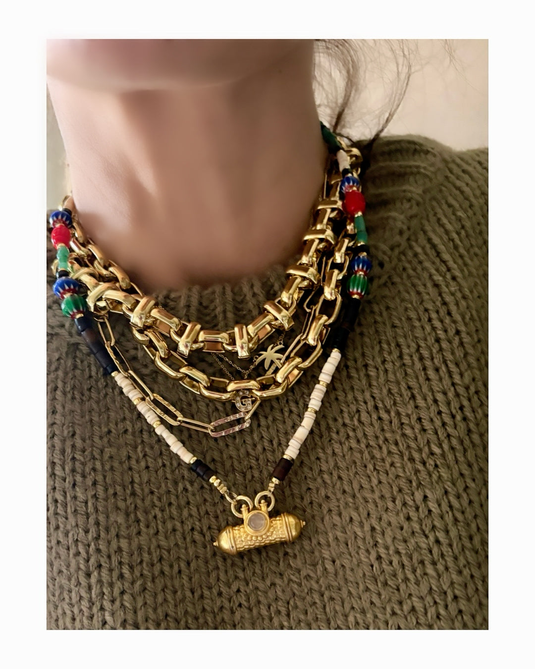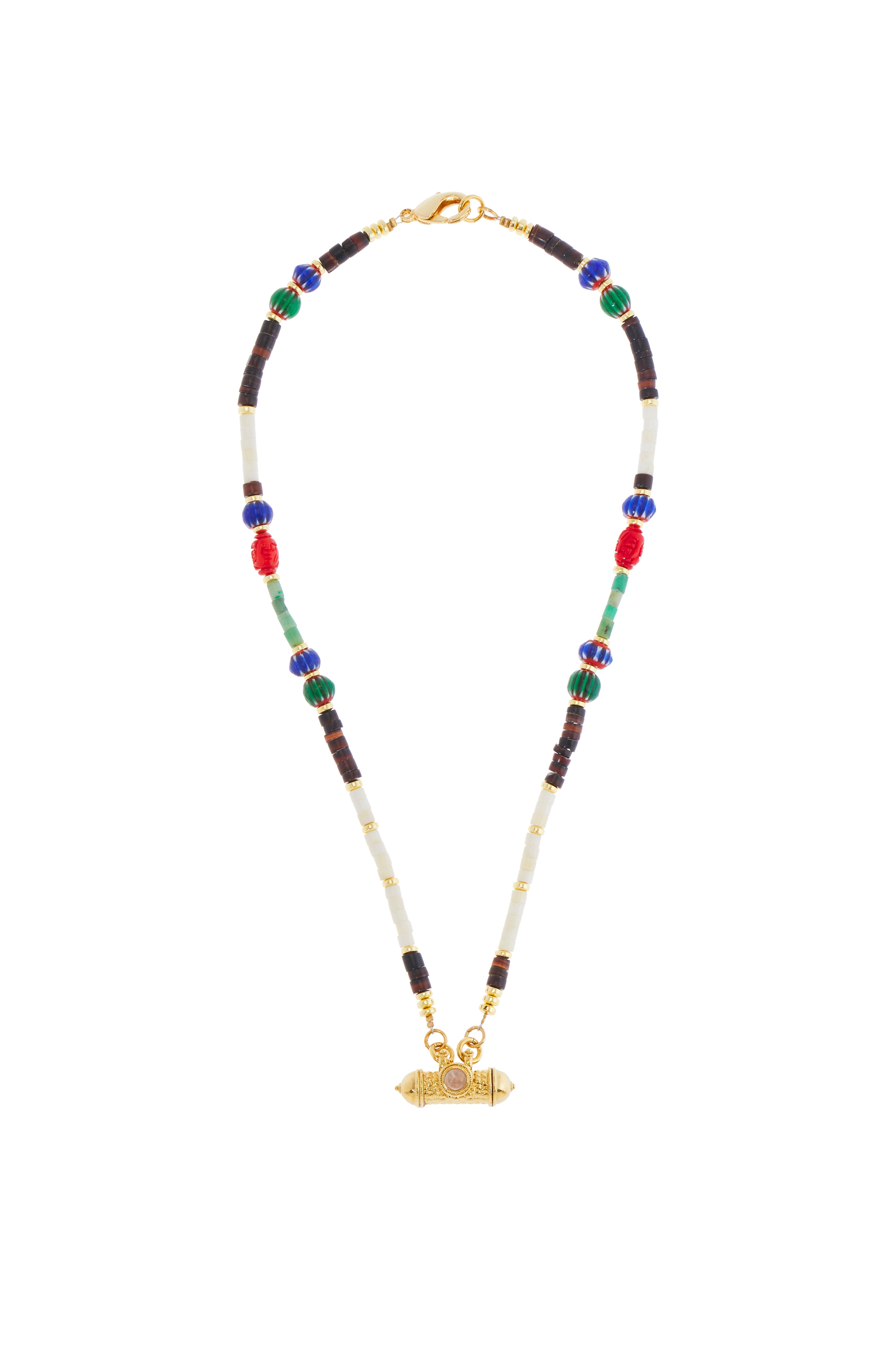 Collana realizzata a mano con pietre diverse, tra cui: ruote di madreperla, onice nero, turchese, corallo bamboo e giada verde. Al centro ciondolo indiano placcato oro 18 kt.