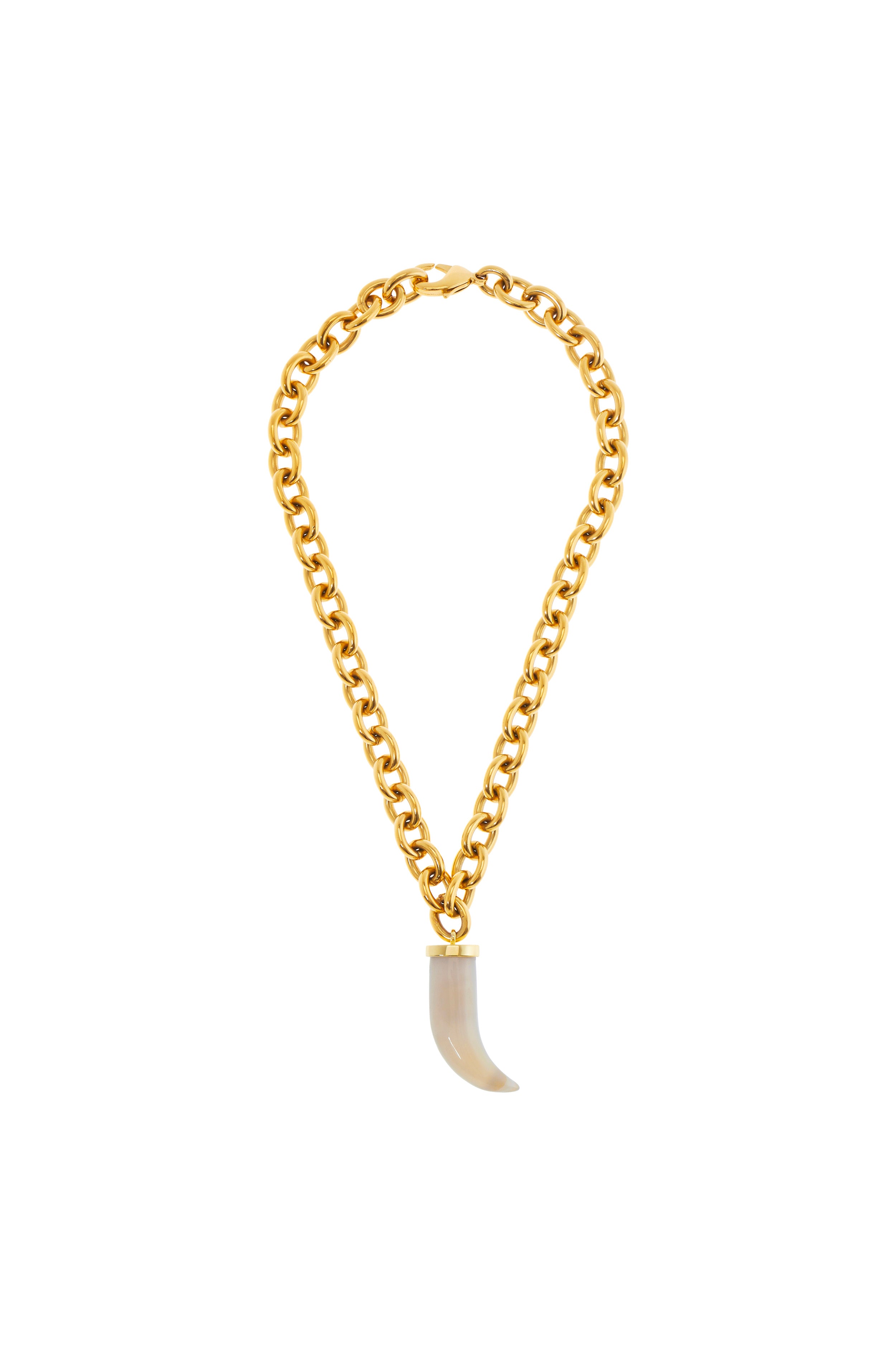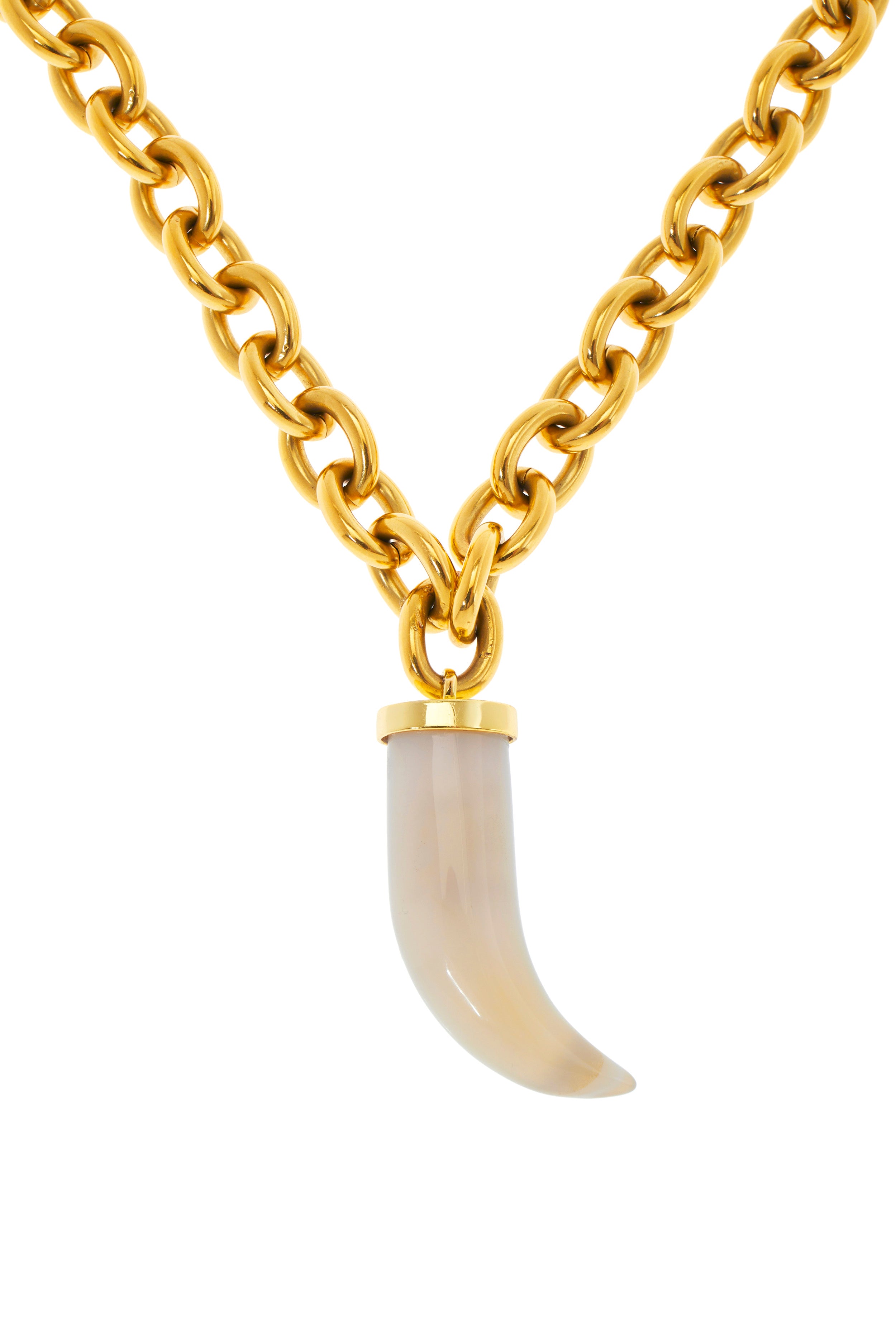 Collana in maglia rolò placcata oro 18 kt e al centro un ciondolo in agata naturale con cappuccio in argento placcato orno. L’utilizzo di pietre naturali rende ogni singolo pezzo unico per sfumature e colore, rendendo ogni collana un pezzo esclusivo . Lunghezza 50 cm