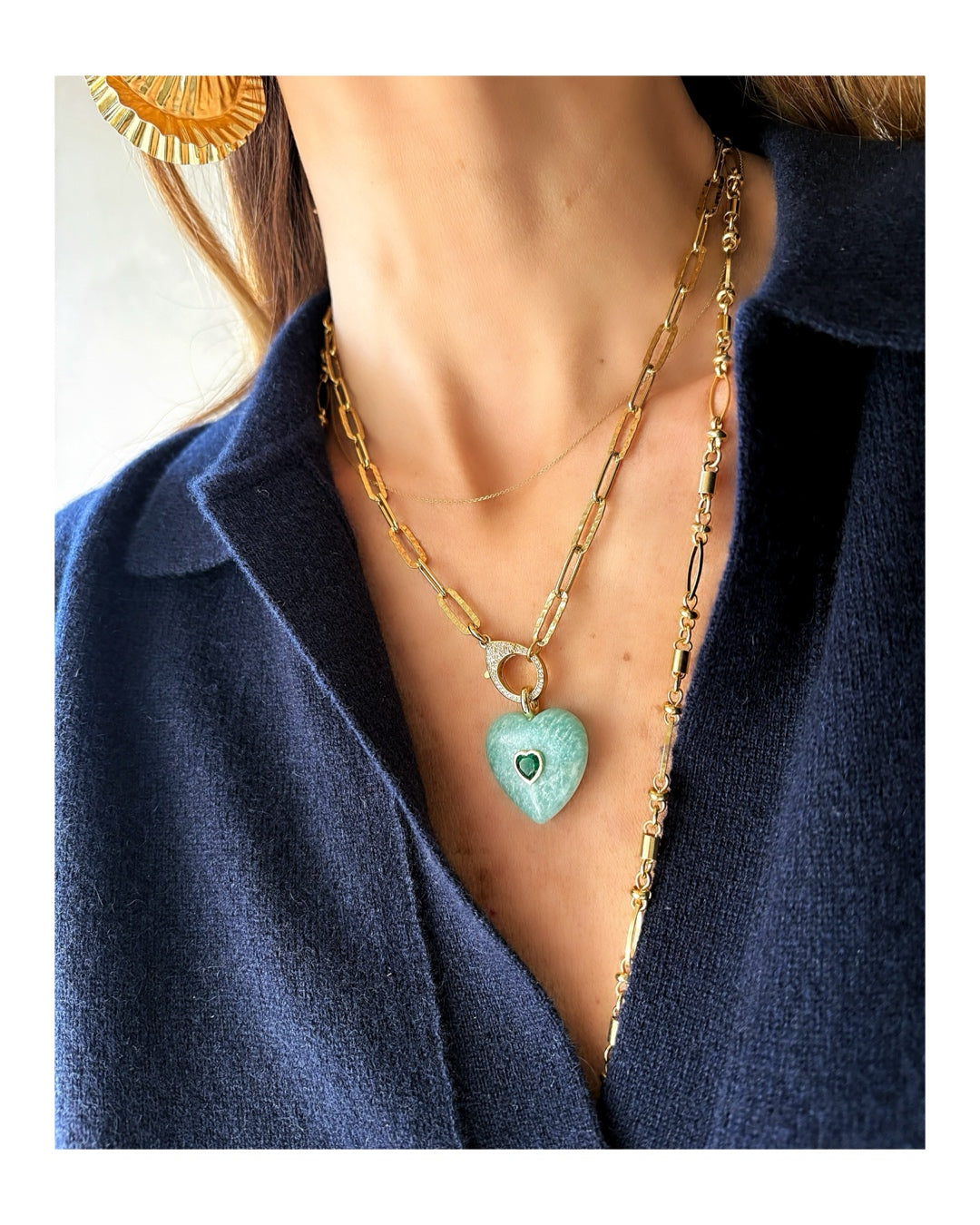 Ciondolo in amazzonite con cuore centrale in quarzo verde.