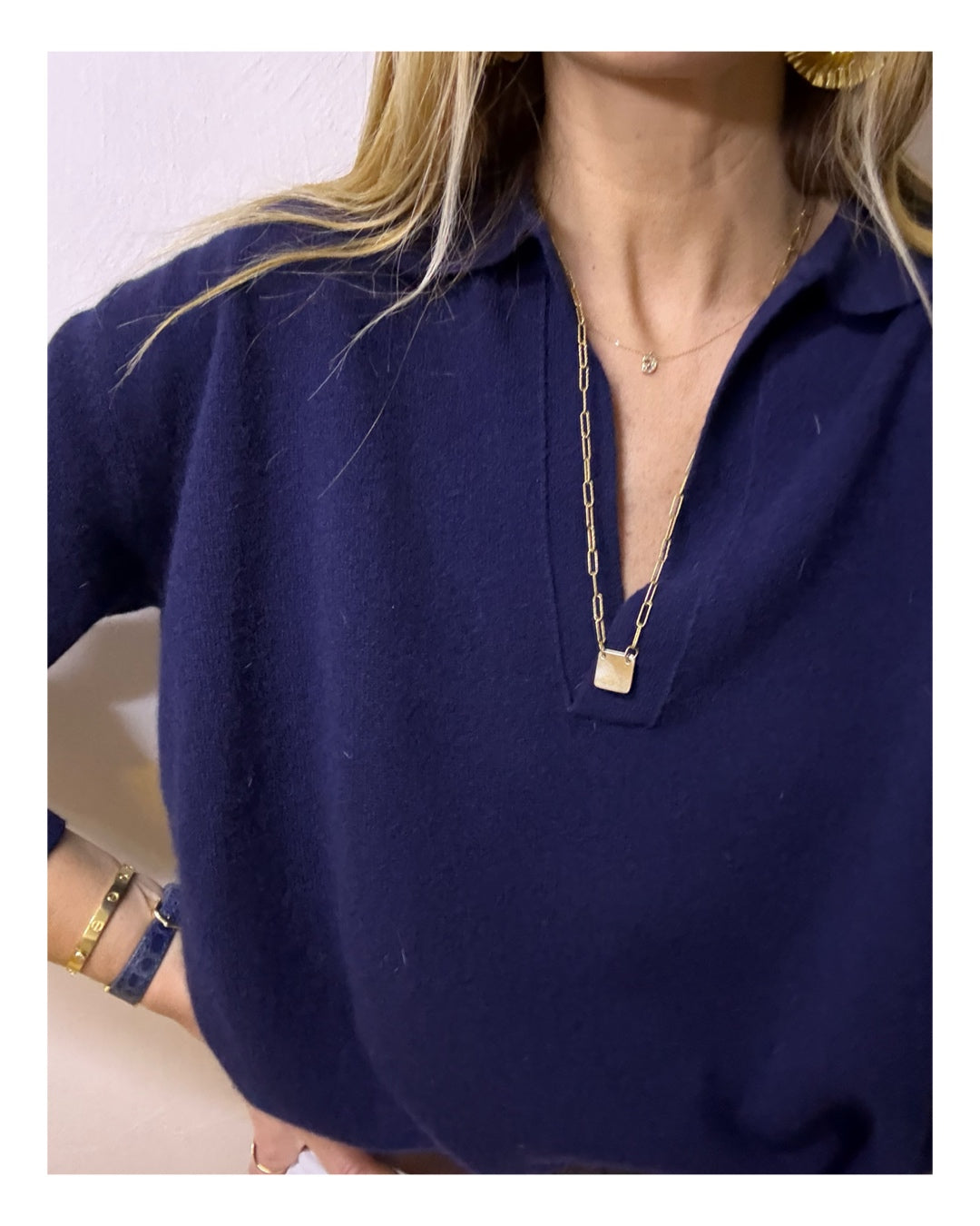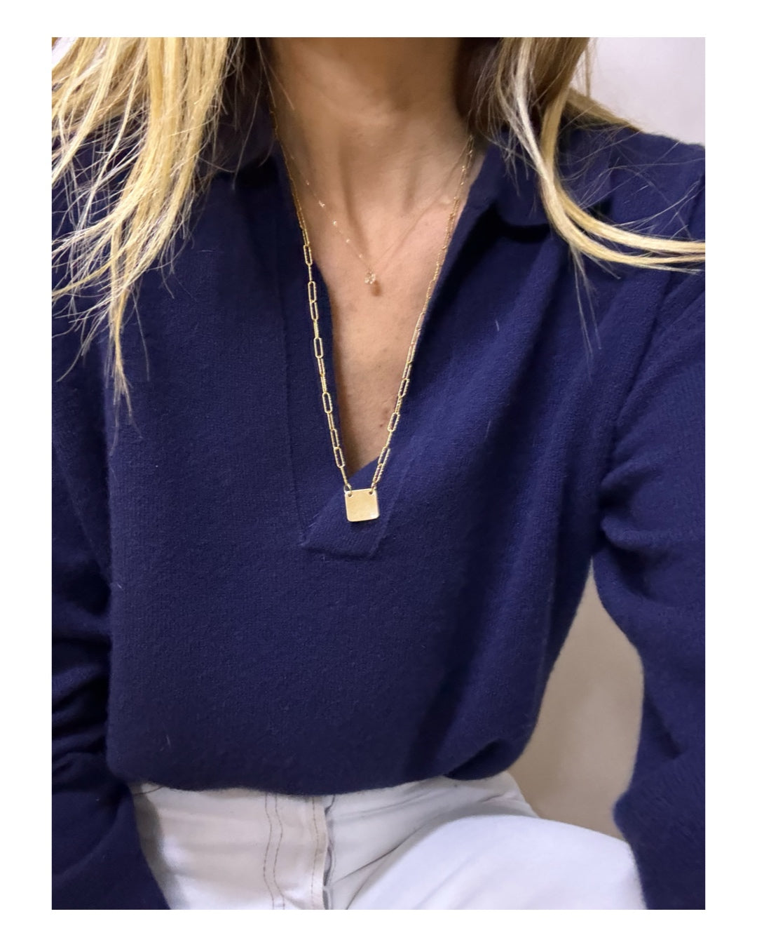 Collana con medaglietta rettangolare e catena geometrica in argento placcato oro 18 kt. Lunghezza 64 cm.